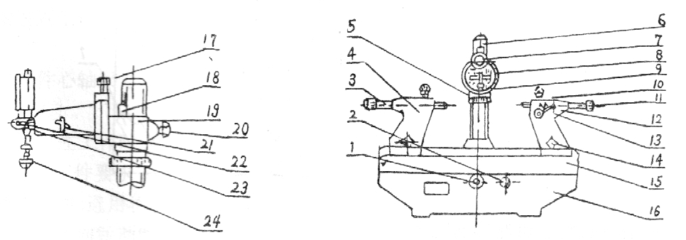 安置在儀器底座16上的臺面15,可用膠木手輪1通過齒條傳動機構(gòu)作縱向移動,并借助膠木螺母2固定。在臺面上的左右頂針架4、12可沿臺面上的基面作縱向移動,可用膠木螺母14固定。頂針3松開膠木螺釘10后可在頂針架孔內(nèi)移動。在右頂針架12上還可用膠木螺釘11緊固頂針3后借助于手柄13作彈簧頂針用。轉(zhuǎn)動升降螺母5,可使測量座19連同測量支架8和千分表7沿立柱6上下移動。使側(cè)頭與被測表面接觸或離開。并用膠木螺釘20使之固定在適當?shù)牟课弧K砷_緊固螺釘17測量支架8可相對于測量座在垂直平面內(nèi)作±900的轉(zhuǎn)動。表架23可利用手柄21抬起或放下。
